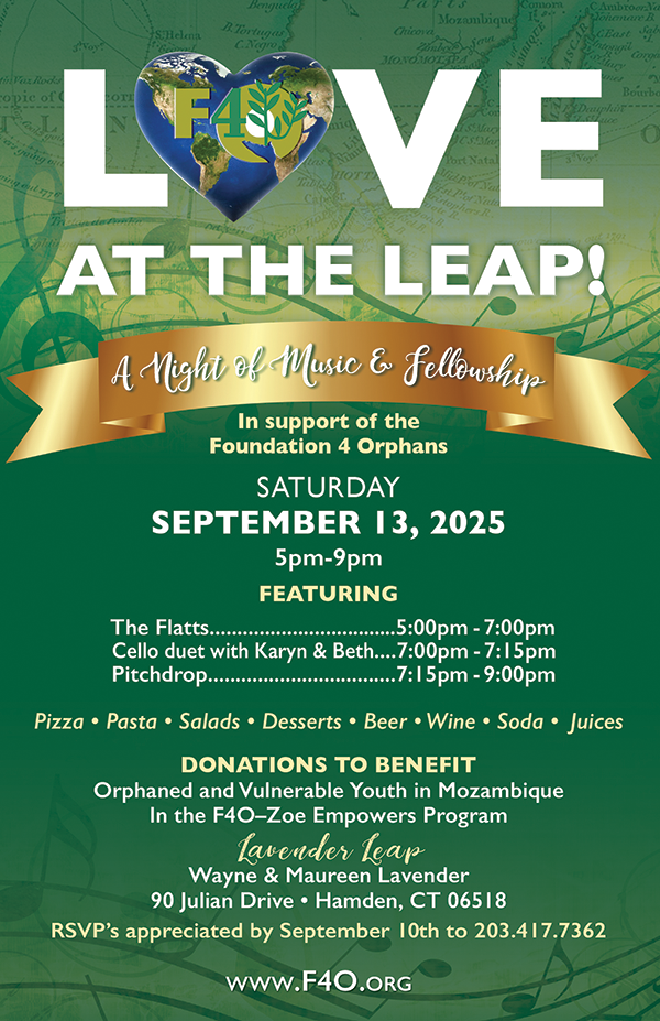 THE FLATTS are playing at the “Love at the Leap” festival in Hamden, September 13. The event is sponsored by the Foundation 4 Orphans, a charity whose mission is to help end the orphan crisis in Mozambique by empowering orphaned and vulnerable youth. Join us for fun, friendship and dancing! For more information on this charity go to Foundation 4 Orphans